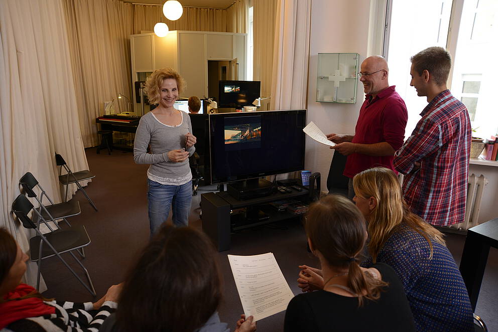 Kursleiterin Katharina Koschny demonstriert live, worauf es beim professionellen Sprechen ankommt: